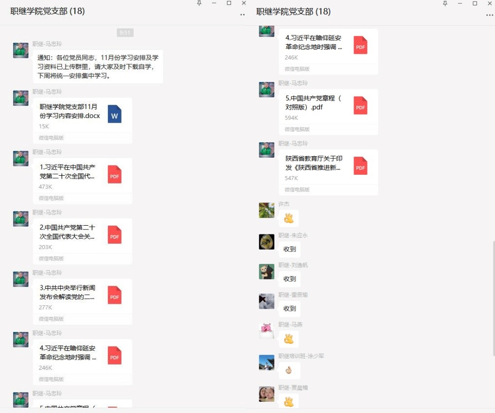 11月初,公司党支部工作人员整理人民日报、中国共产党员网、新华网等主流权威媒体发布的相关稿件,形成党的二十大系列学习文件并推送到微信支部群,要求教职工党员深入自学,并互相讨论交流。