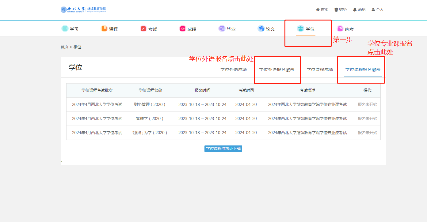 3、报考三门业务课的考生,点击“学位课程报名缴费”栏,进行报名。(三个科目均需点击报名)