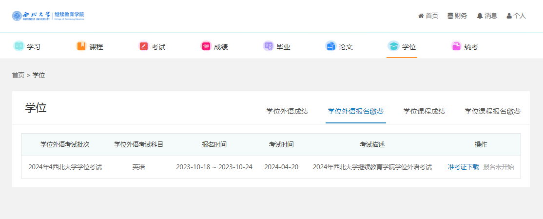 2、报考外语的考生,点击“学位外语报名缴费”栏,进行报名。