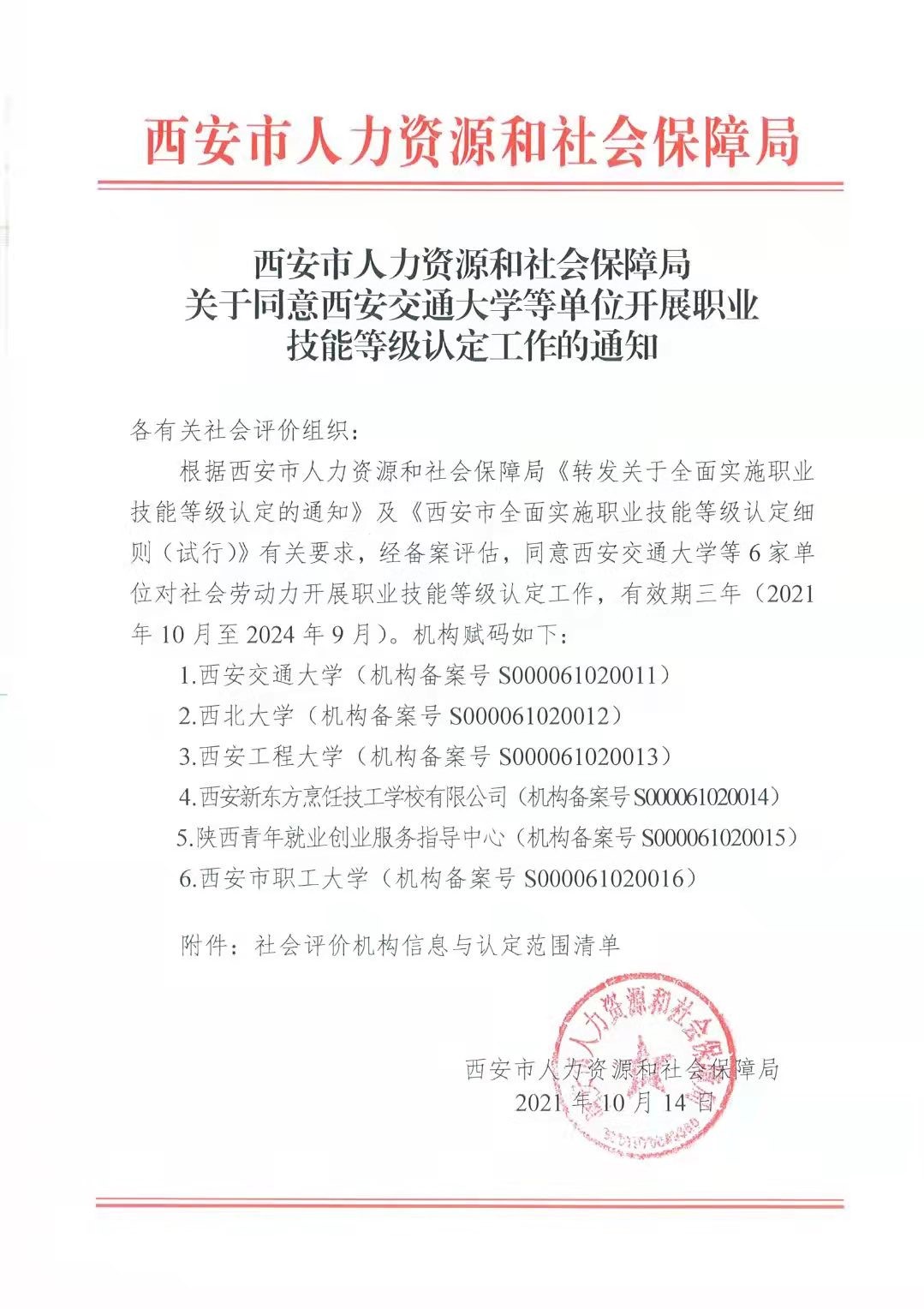 2021年10月根据西安市人力资源和社会保障局《转发关于全面实施职业技能等级认定的通知》及《西安市全面实施职业技能等级认定细则(试行)》的有关要求,经备案评估,同意公司对社会劳动力开展职业技能等级认定工作。此次认定机构的批复,标志着公司在服务社会的职能上又迈出了坚实的一步。