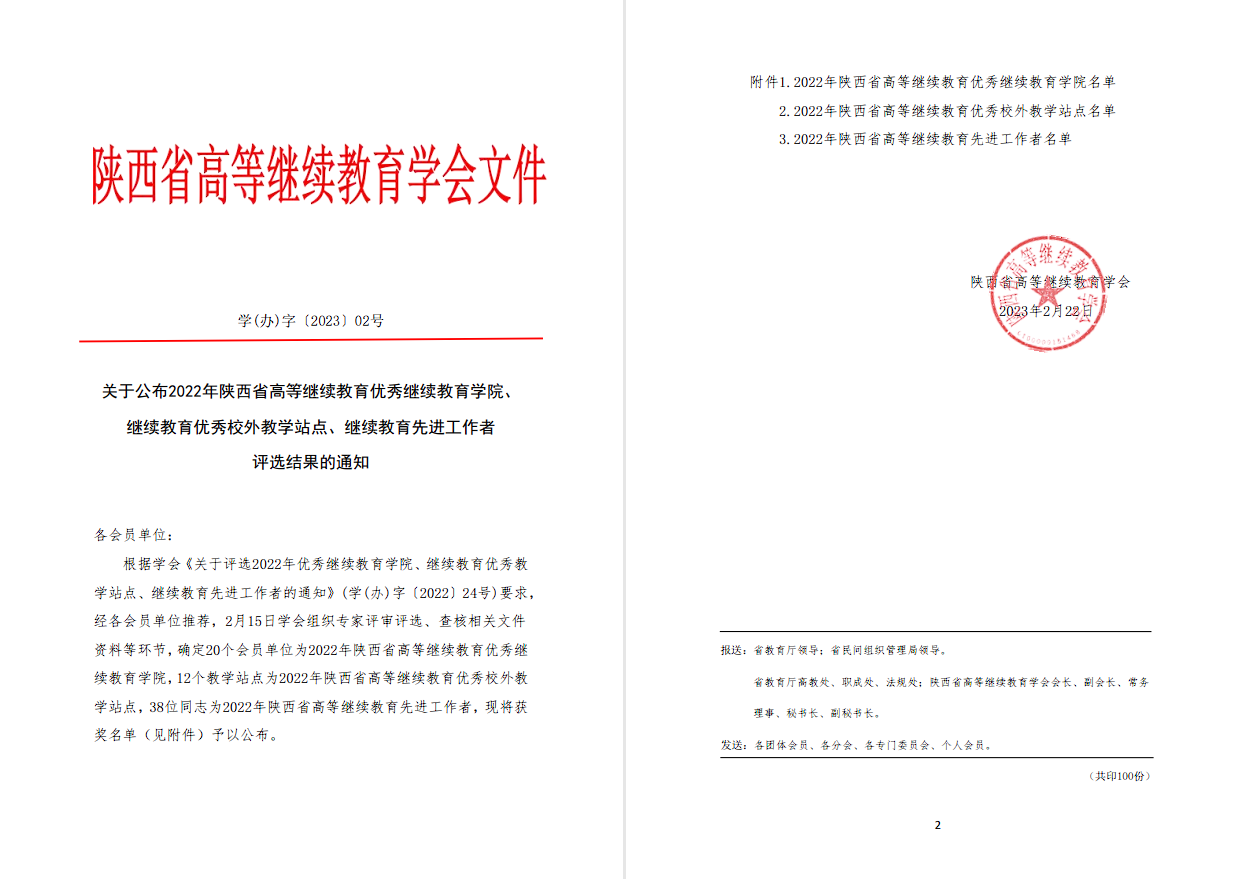 【学(办)字〔2023〕02号关于公布2022年陕西省高等继续教育优秀z6mg人生就是博官网、继续教育优秀教学站点、继续教育先进工作者评选结果的通知(1).pdf】已下载次